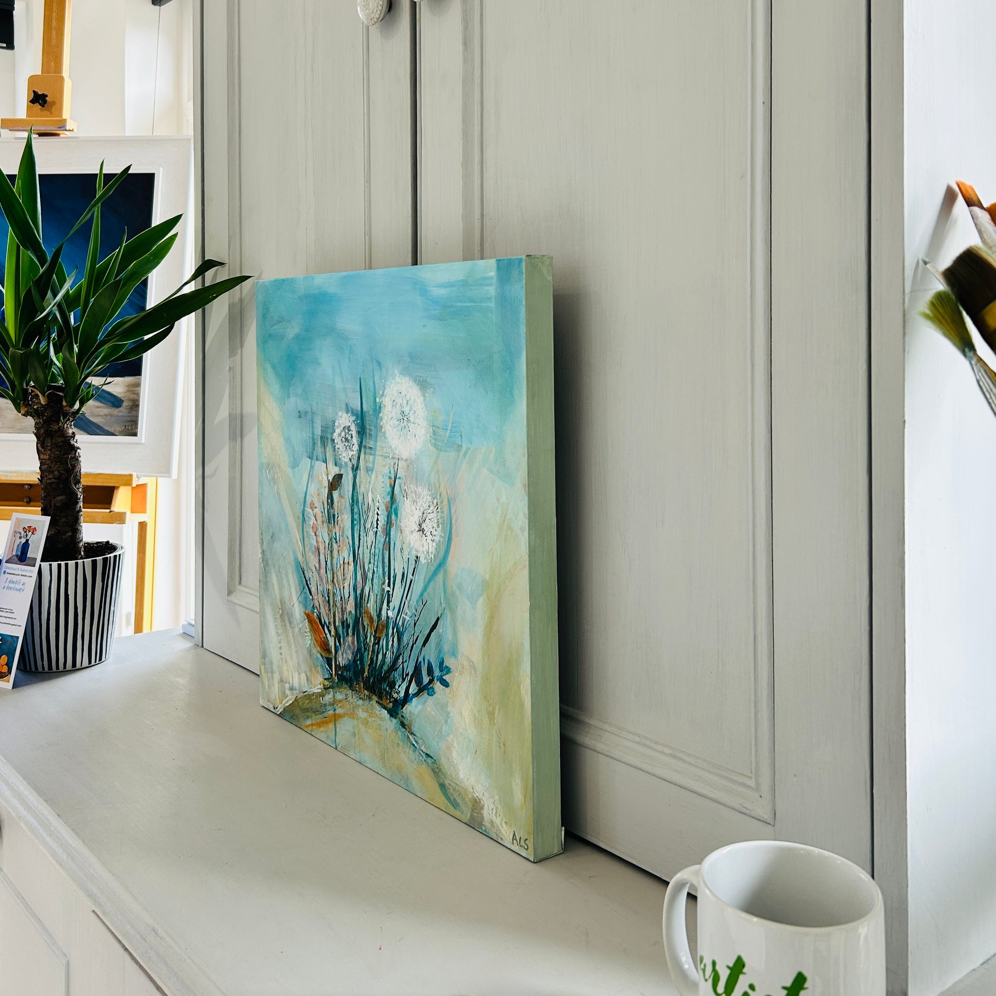 Blow Ball Botanical is Mixed Media including Collage on a deep edged stretched Canvas. All strung ready to add nature infused beauty to your wall.