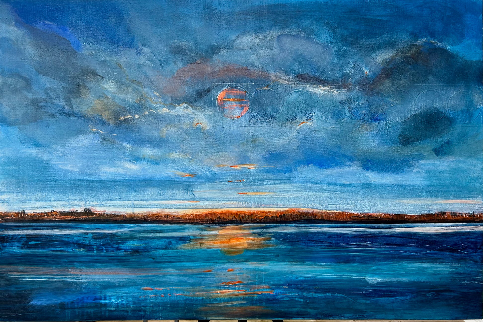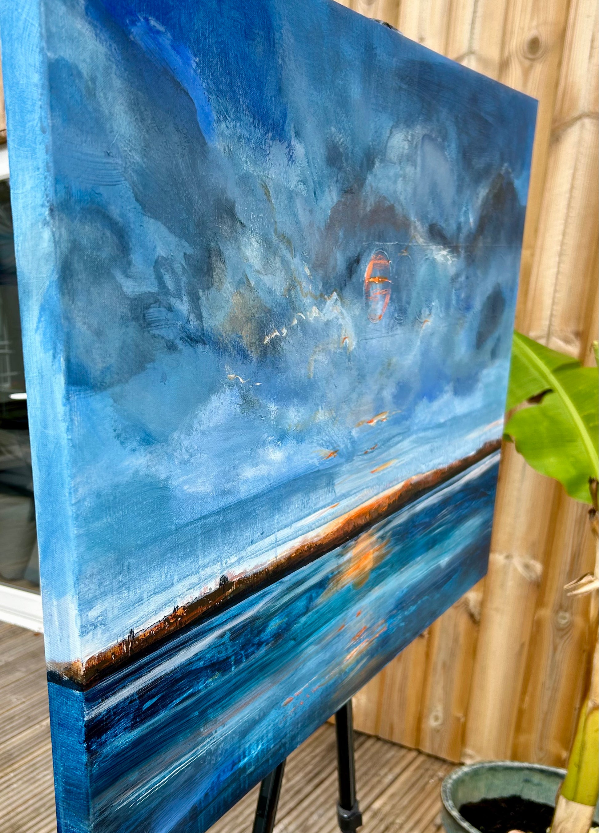 Boundless Blue is a captivating abstracted seascape that evokes a sense of calm, vastness, and infinite possibility. Layers of rich cobalt, deep indigo, and serene aquamarine sweep across the canvas, suggesting shifting tides and an endless horizon, while warm highlights of copper and orange reflect a glowing sun just out of reach in the dramatic sky. On close inspection you can see the added texture of the coastal line and the faint circles of the moving sun. This modern coastal painting blends expressive brushwork with a dreamlike palette, inviting moments of reflection and serenity. Perfect for contemporary interiors, beach homes, tranquil bedrooms, or minimalist living spaces, Boundless Blue adds a statement of peace and expansiveness to any wall. Ideal for lovers of ocean-inspired art and soothing blue wall decor.