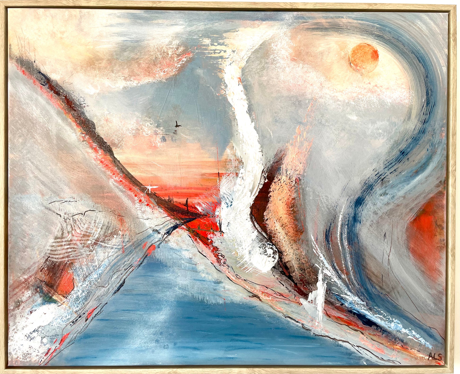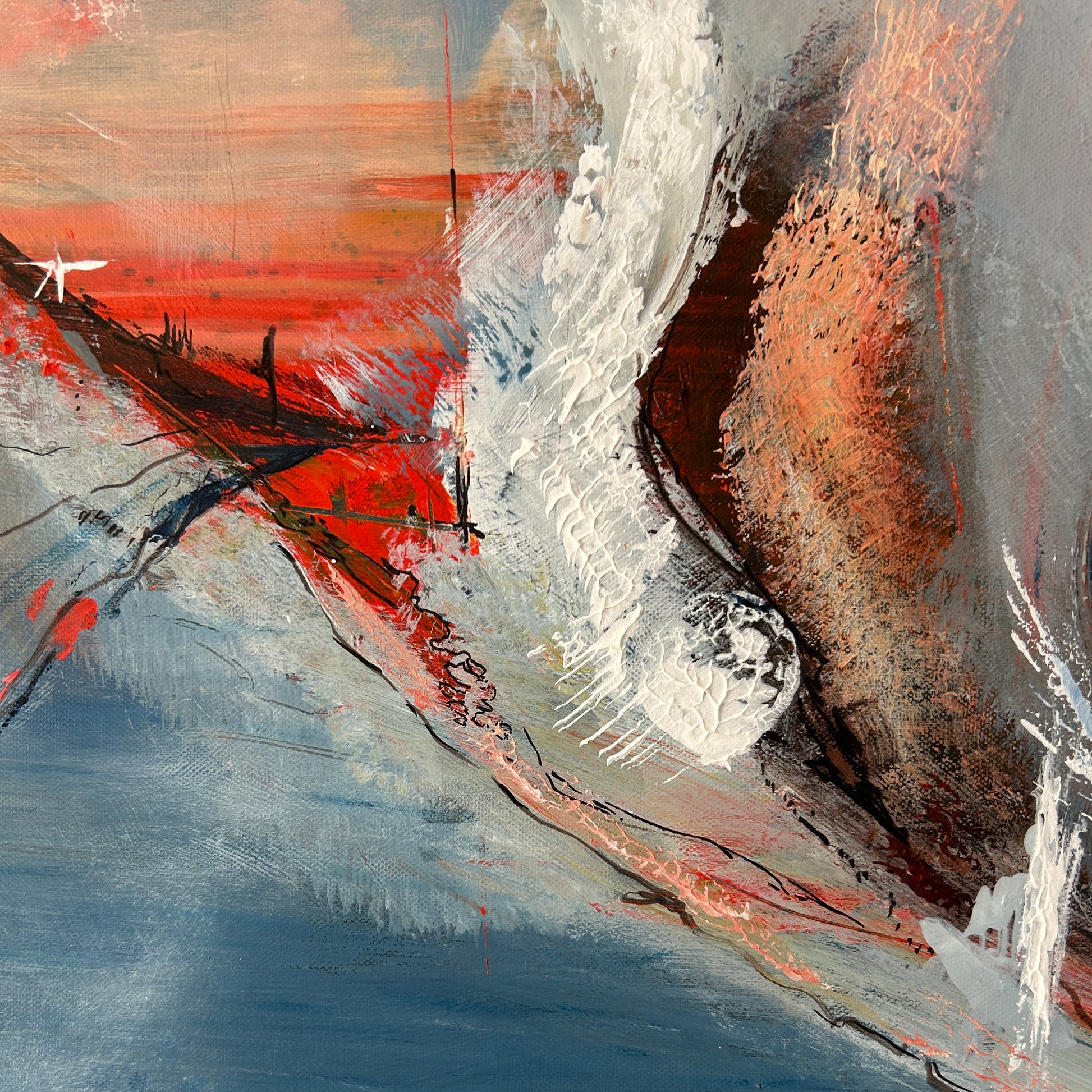 A captivating coastal inspired abstract painting, that blends fluid movement with bold dynamic brushstrokes and textures. The interplay of calm blues, soft neutrals and the fiery orange reds, evokes the energy of ocean currents meeting rugged coastline and dramatic sun touched sky’s. This original artwork brings a sense of balance, serenity and an injection of energy, making it an ideal piece for modern, contemporary or coastal homes. Confluence is a unique statement abstract-seascape perfect for those who want to bring a natural joyous seaside energy into their home. This also goes perfectly with ‘Rhapsody’ as painted in the same palette.