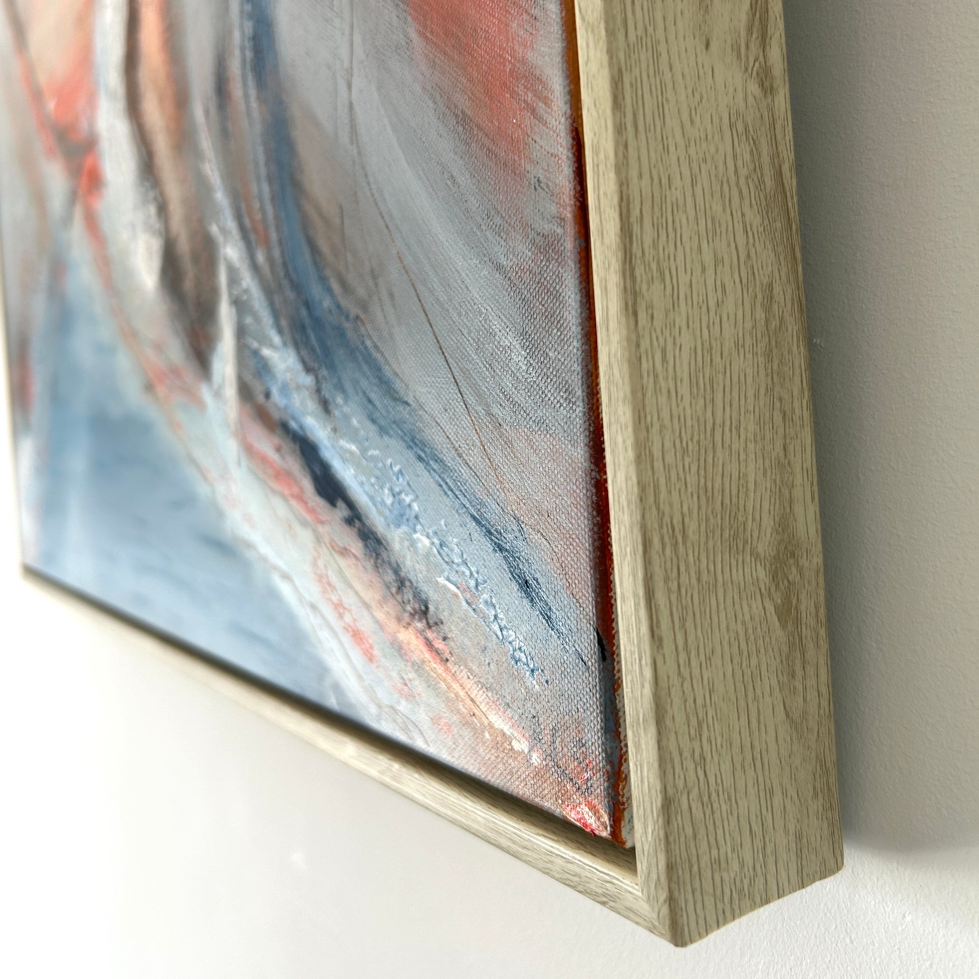 Confluence and Rhapsody are acrylic and mixed media on re-cycled canvas set in a light natural wood effect float frame. All strung and ready to hang and transform your space.