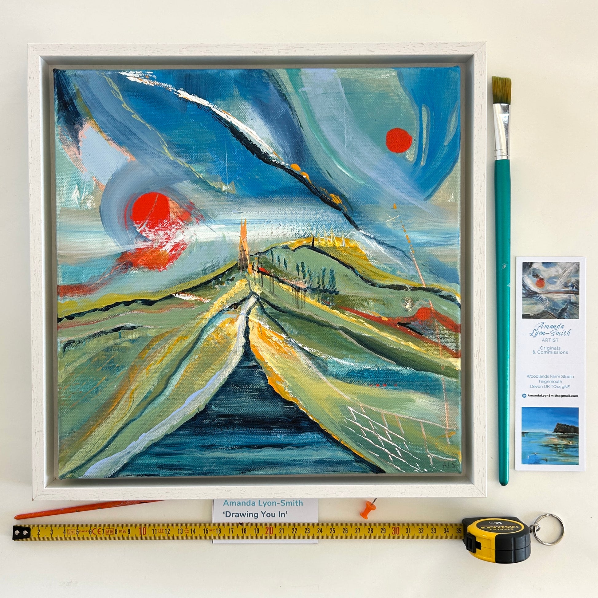 Drawing You In is Acrylic and mixed media on a primed canvas, framed in a lovely white wooden float frame.
