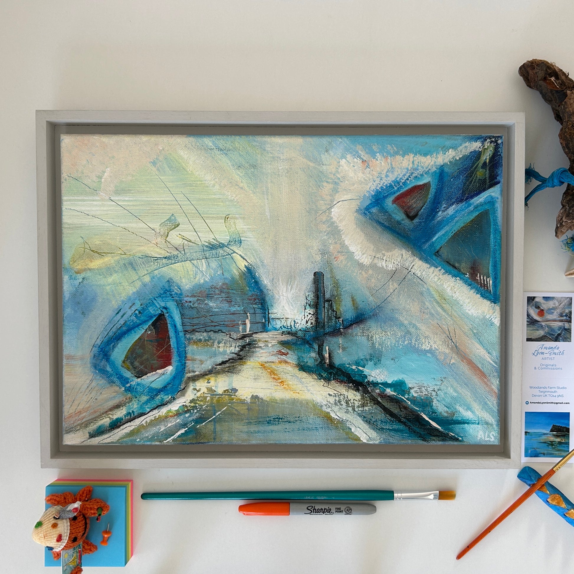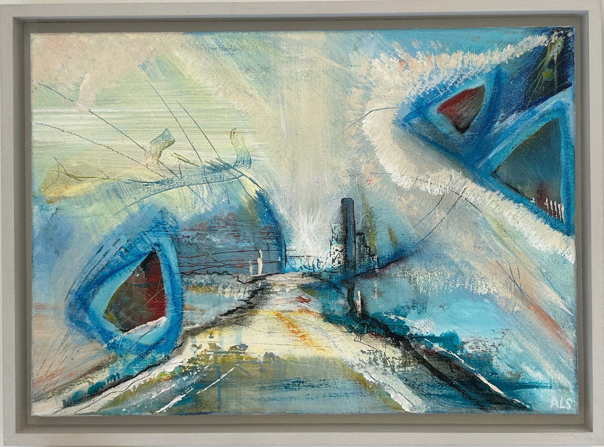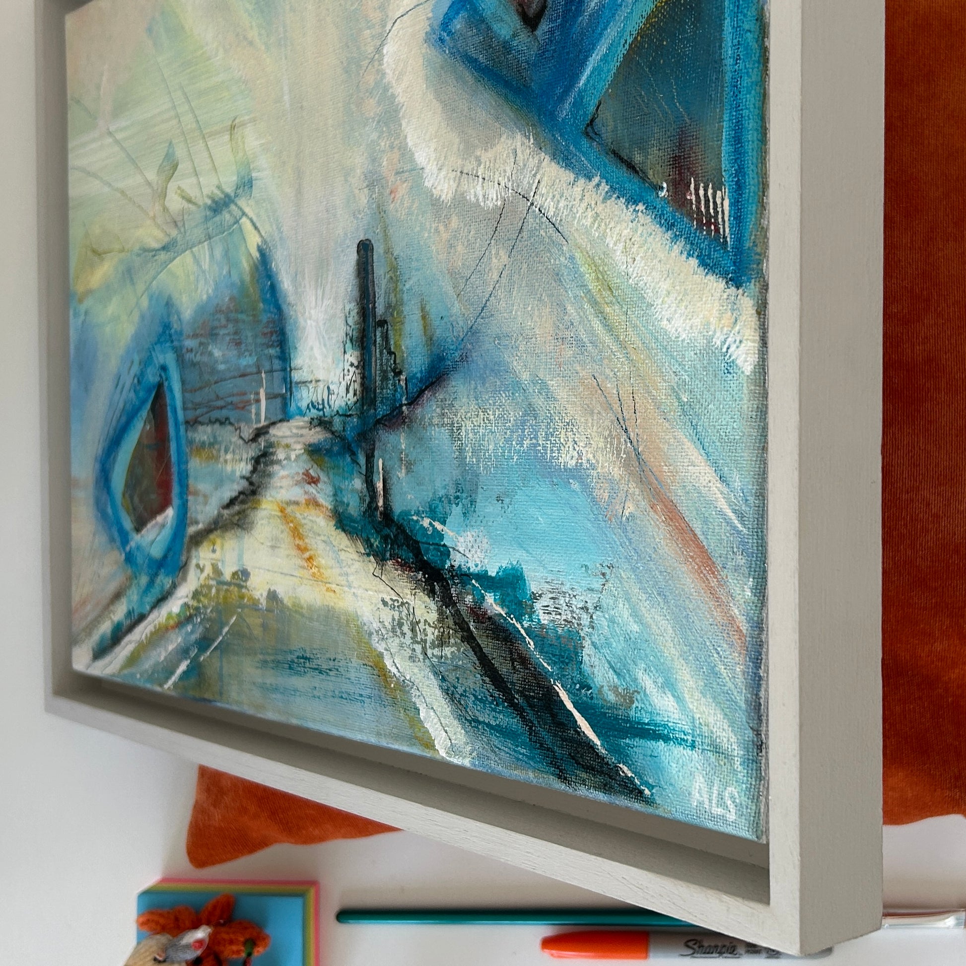 Original Mixed Media Abstract on Canvas, beautifully framed in soft ‘farrow and ball’ grey, wooden painted, float frame. All ready to hang and be admired.