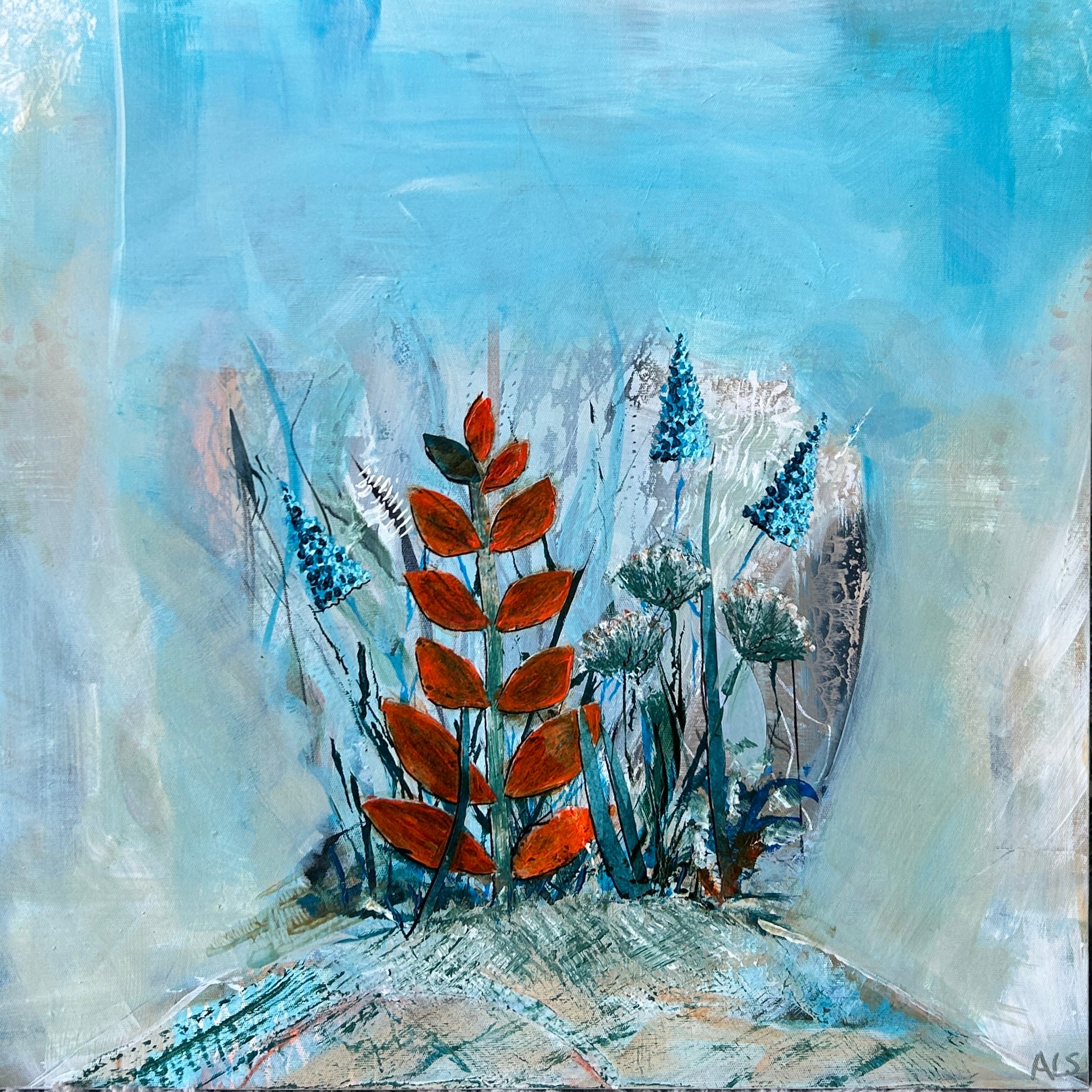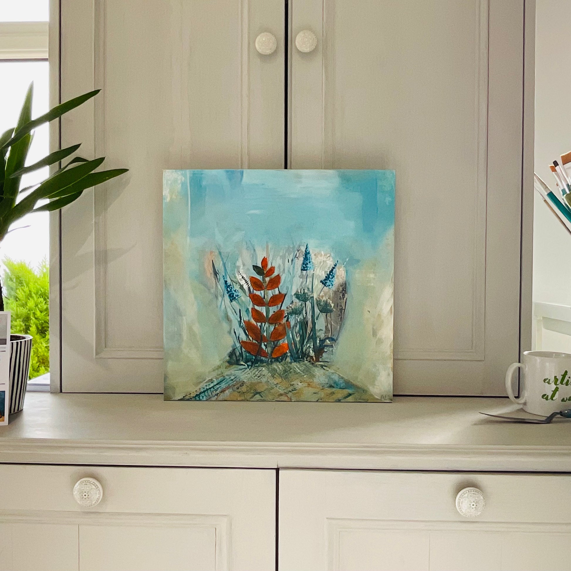 This mixed media artwork with a serene blend of calming blues, bringing peace and openness, then vibrant oranges evoking warmth and energy. The organic natural floral elements, bring the outdoors in, giving a sense of tranquility and vitality to any home. The little pops of purple flower heads infuse optimism and hope. It would work in most rooms of your home as both a stand alone piece or with one or both of the other two botanicals in this range. Blow Ball and Daisy Botanical