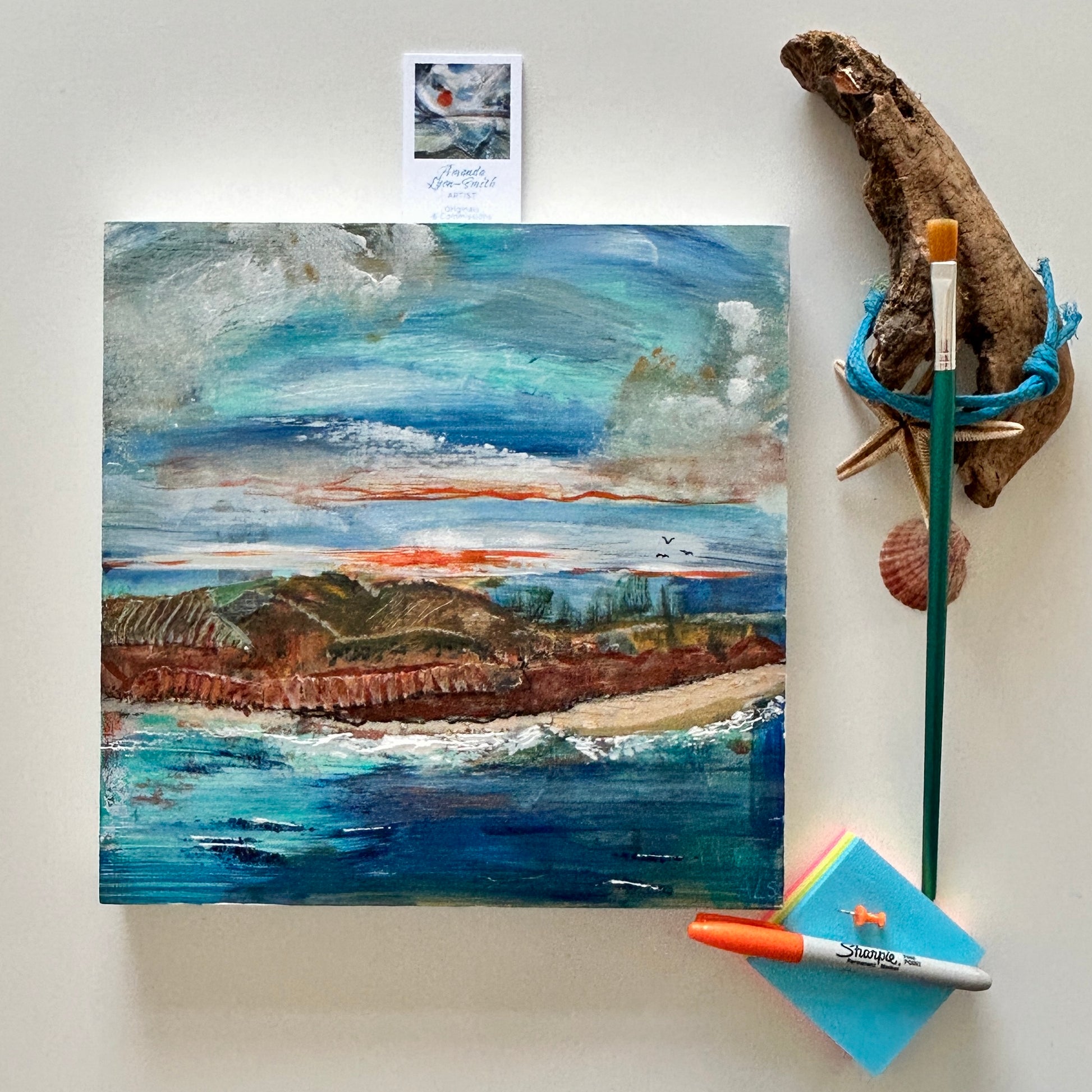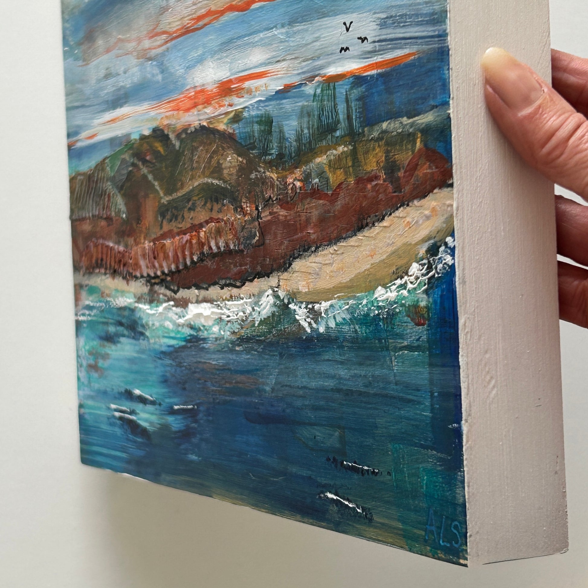 This bold expressive coastal-inspired mixed media painting, including collaged textures, captures the raw, untamed beauty of the Jurassic coastline. Rich earthy tones of the Devon cliffs sit equally within the sea turquoise blues below and the dramatic sun touched sky above. A lovely sense of movement with the frothy white waves kissing the wet sand. This piece brings a dynamic adventurous spirit to any space, perfect for a modern coastal interior, a contemporary home, or any room seeking a touch of drama and tactile texture. An uplifting artwork that energises and inspires those who experience it. It works wonderfully as a diptych with ‘Devon’s Meandering Coast’
