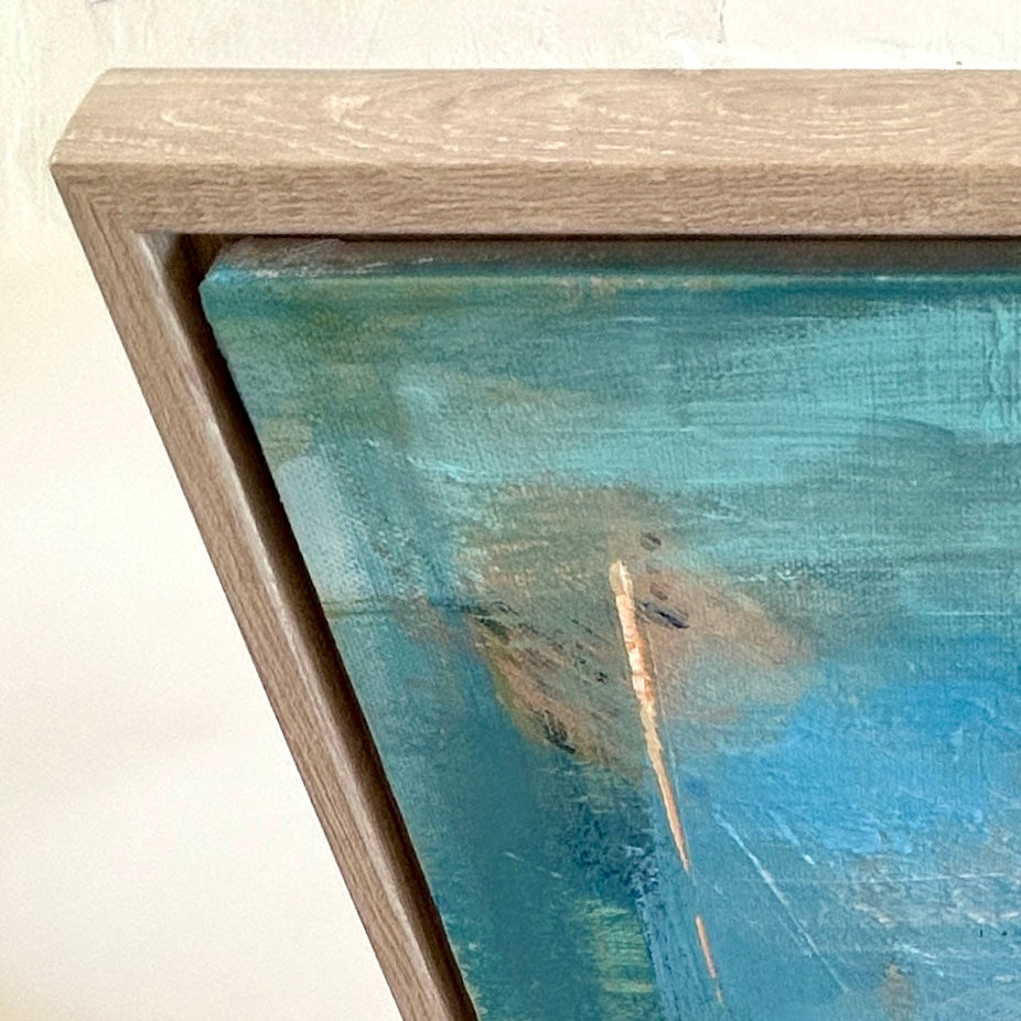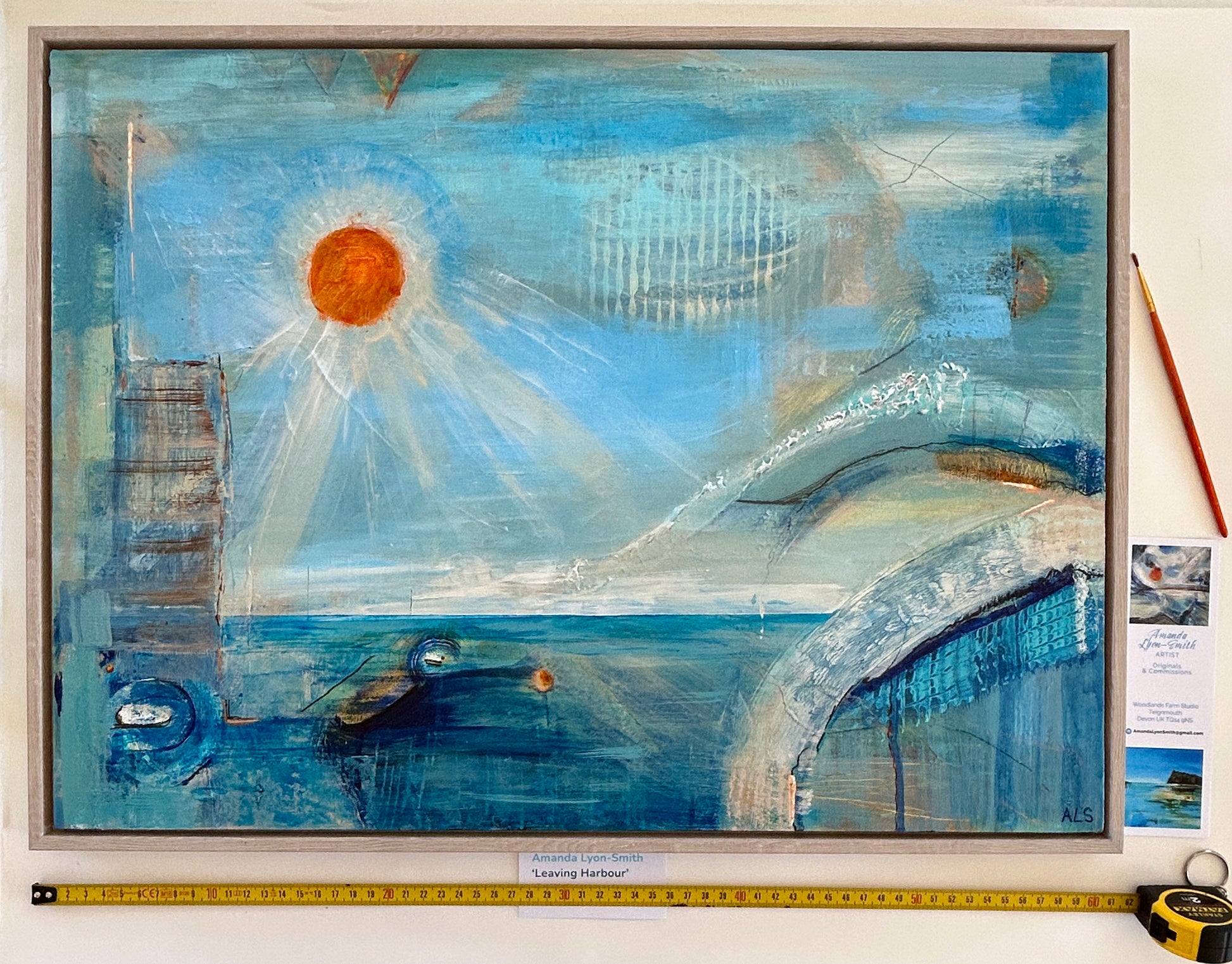 Leaving Harbour is Acrylic and Mixed Media on a stretched canvas set in a taupe wood effect float frame, strung and ready to hang.