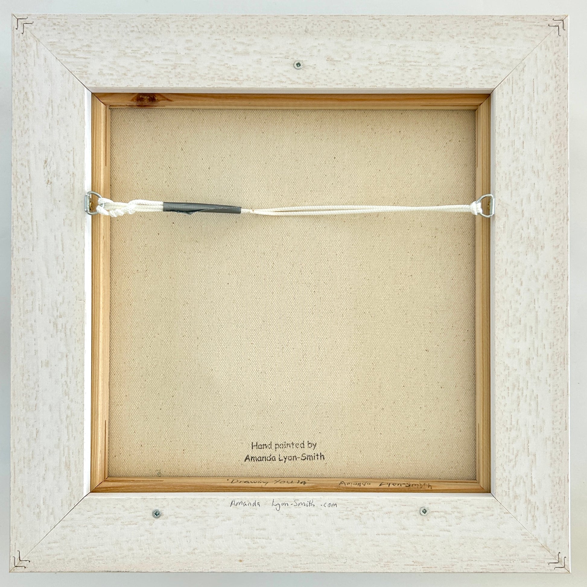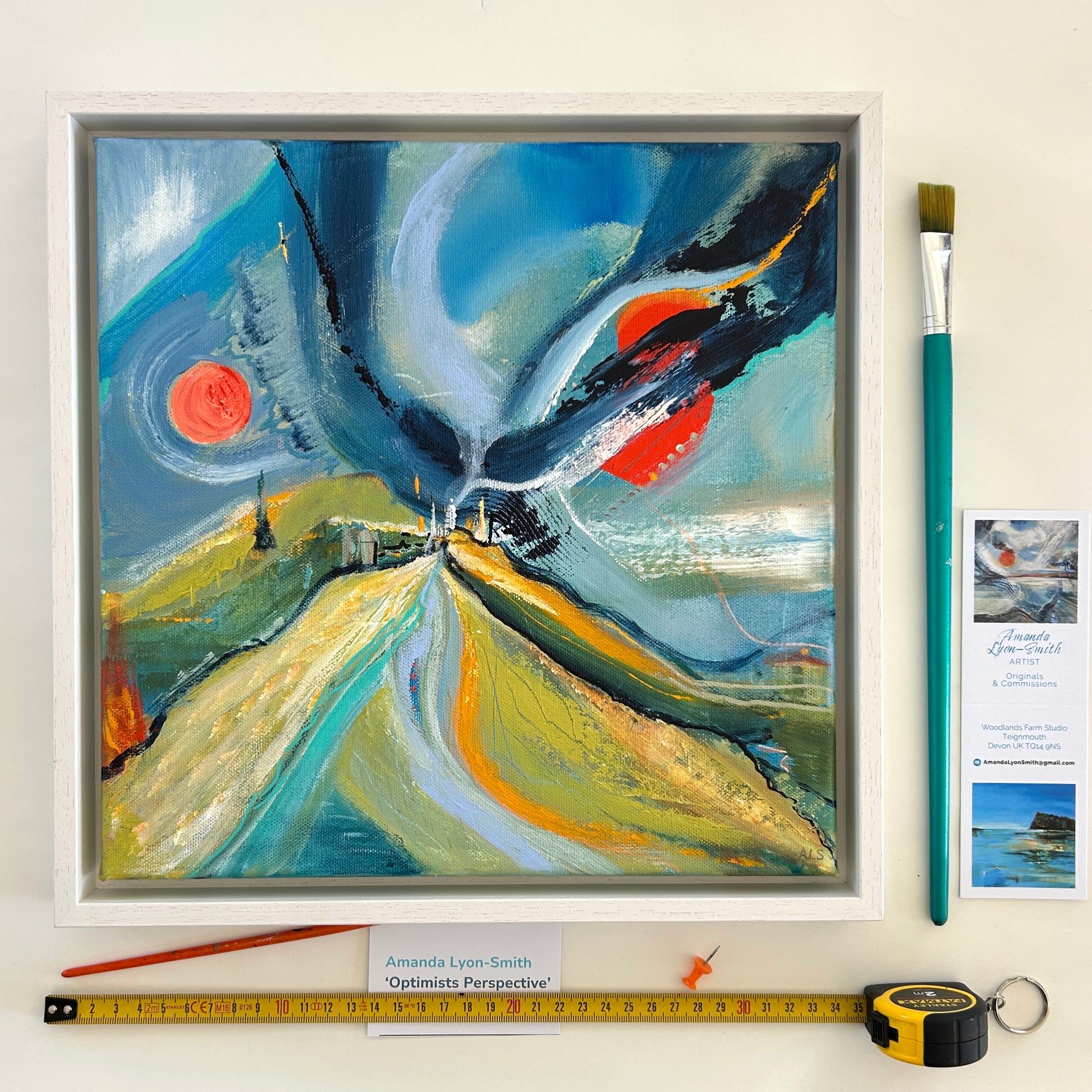 Optimists Perspective is acrylic and mixed media on canvas and framed in a lovely white wooden float frame.