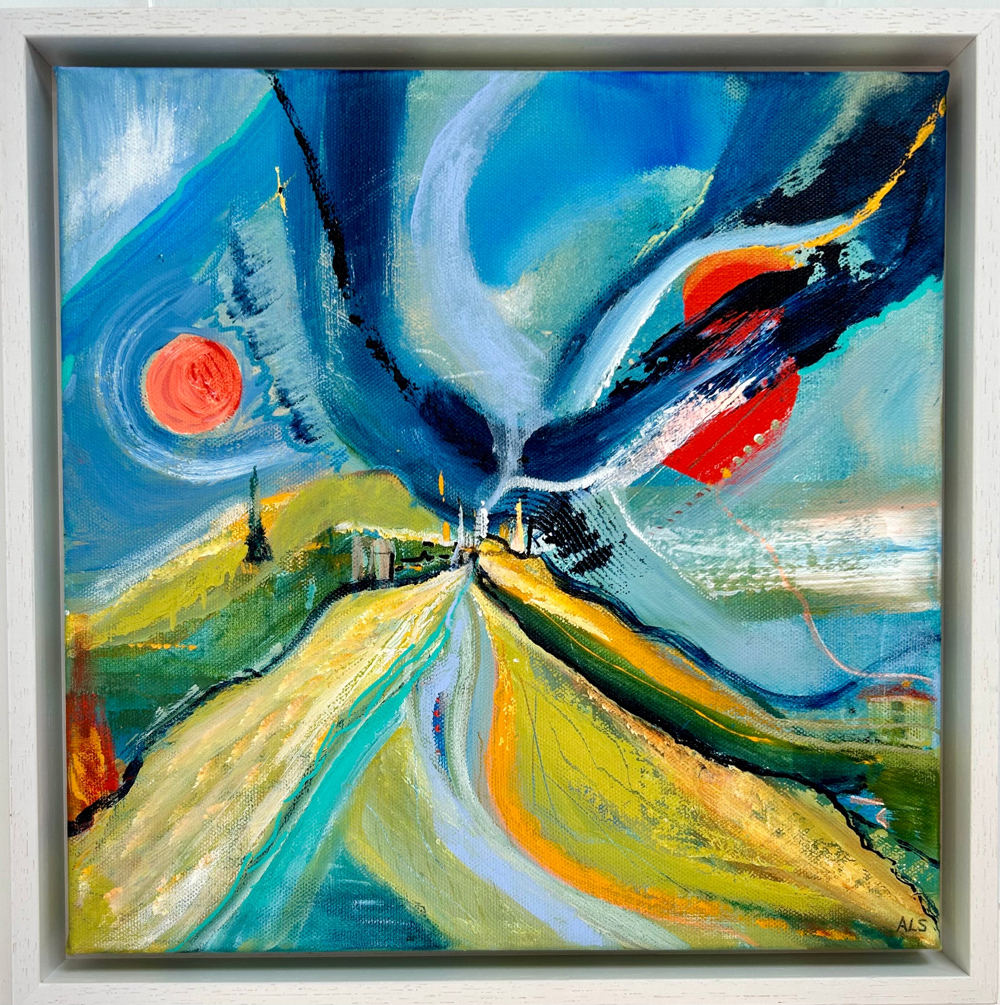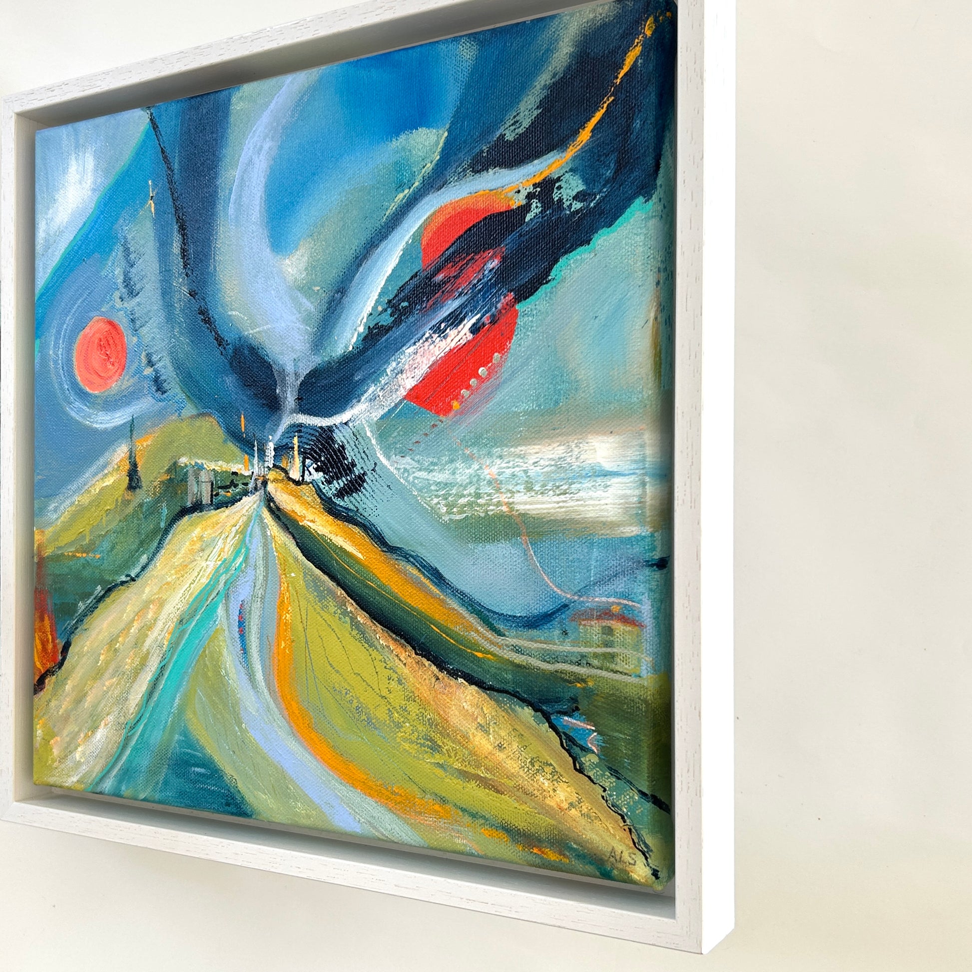 This vibrant abstract landscape is pure joy. Taking you on an immersive country adventure through sweeping green fields and up to a dramatic sun-touched blue sky-scape. The dynamic brushstrokes and rich texture create a sense of depth as though you are standing on a hillside, breathing in fresh country air. This abstract is perfect for a home or office that wants to infuse its space with wonderful natural energy. It will bring a burst of colour to contemporary, modern, period or country homes. Ideal for Art lovers looking for uplifting art with a connection to nature.