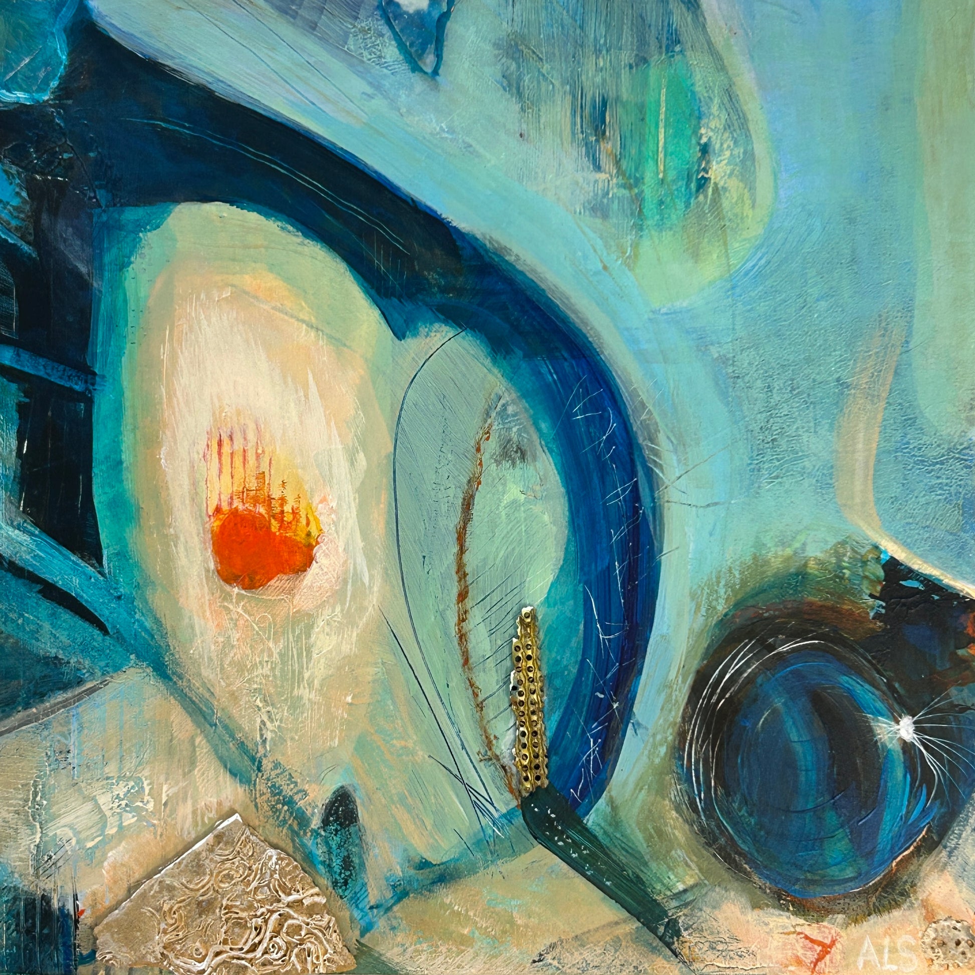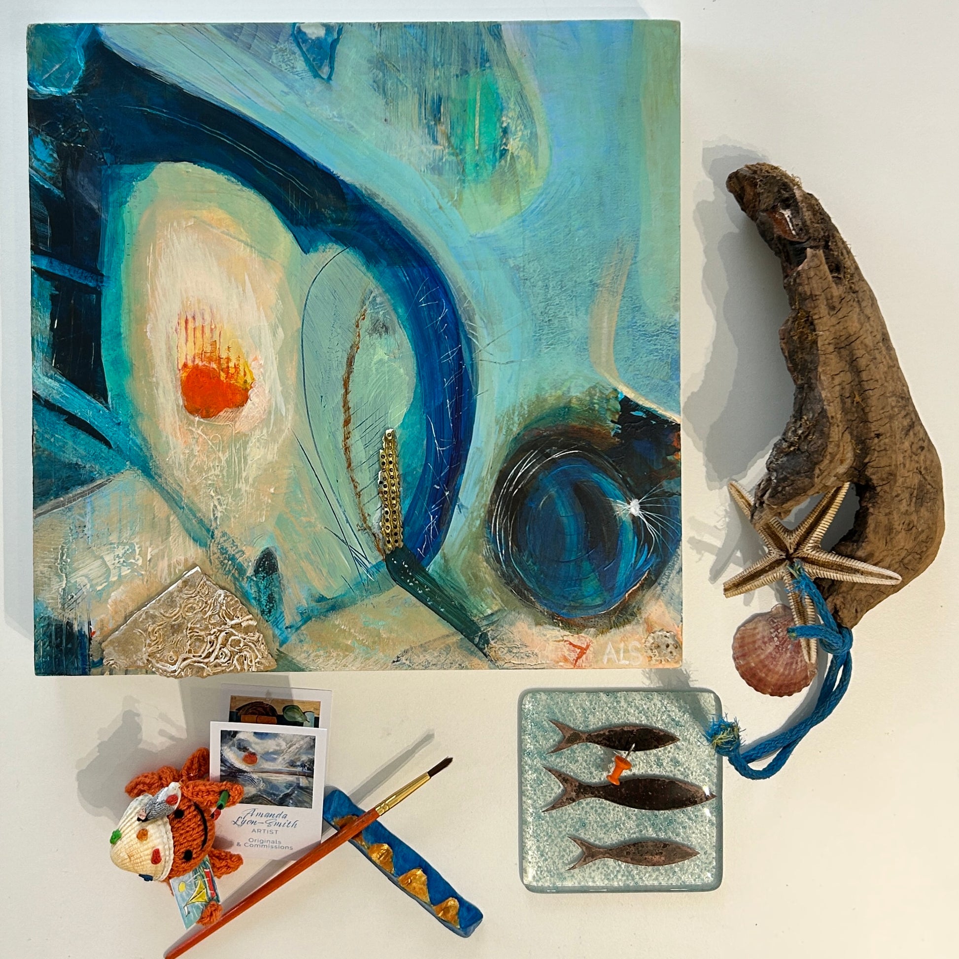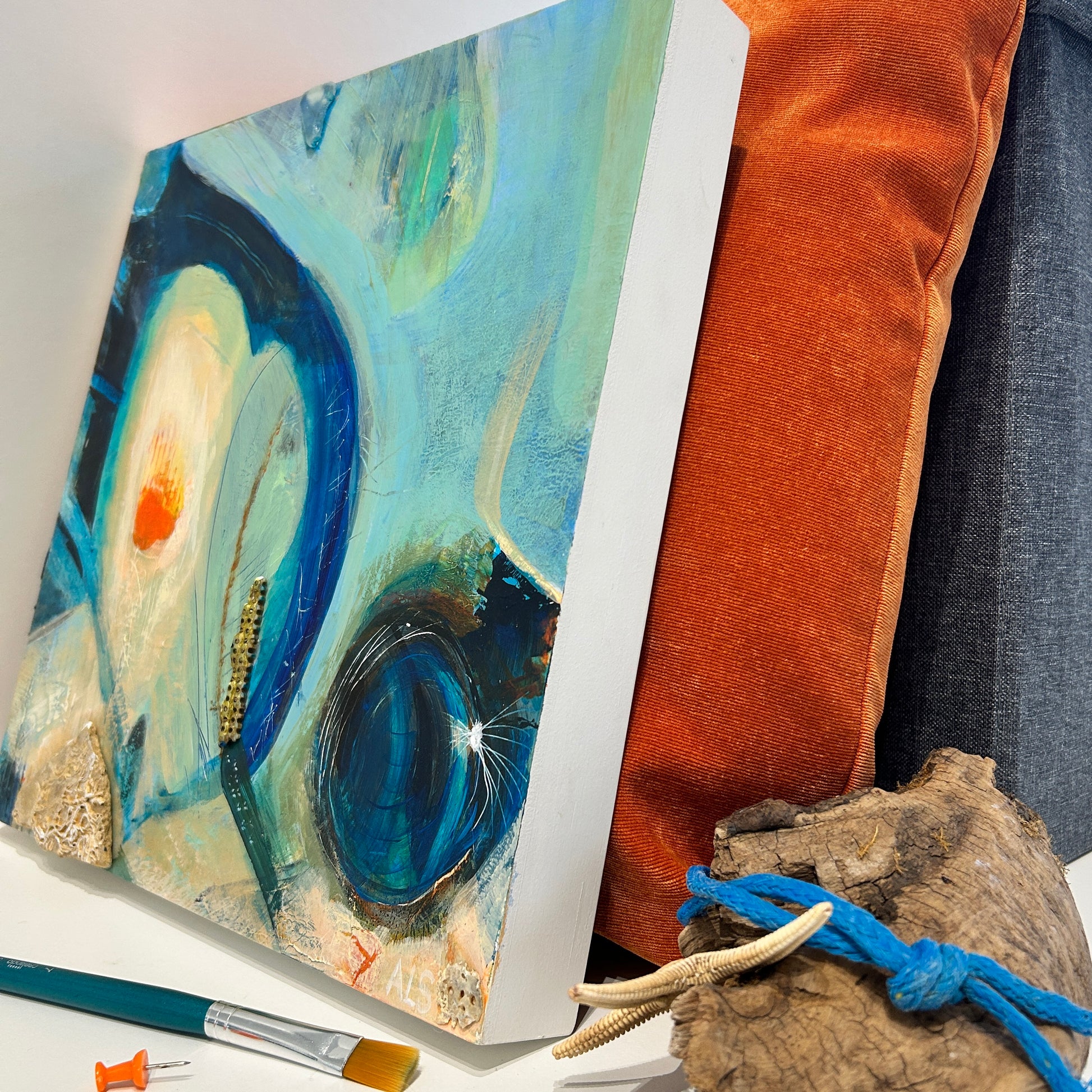 Is a captivating mixed media artwork that captures the essence of coastal exploration through bold abstraction and the incorporation of collaged flotsam. Deep turquoise blues, hot fiery orange and soft peachy ochres create a harmonious work of art. The found objects add a tactile, weathered quality, grounding the piece in the raw beauty of beach-combed treasures. Ideal for contemporary interiors, seaside homes or creative retreats, this artwork invites contemplation as the soft organic shapes evoke love and harmony. This intuitive piece is perfect for those who seek unique, coastal-inspired art that blends texture, movement and storytelling.