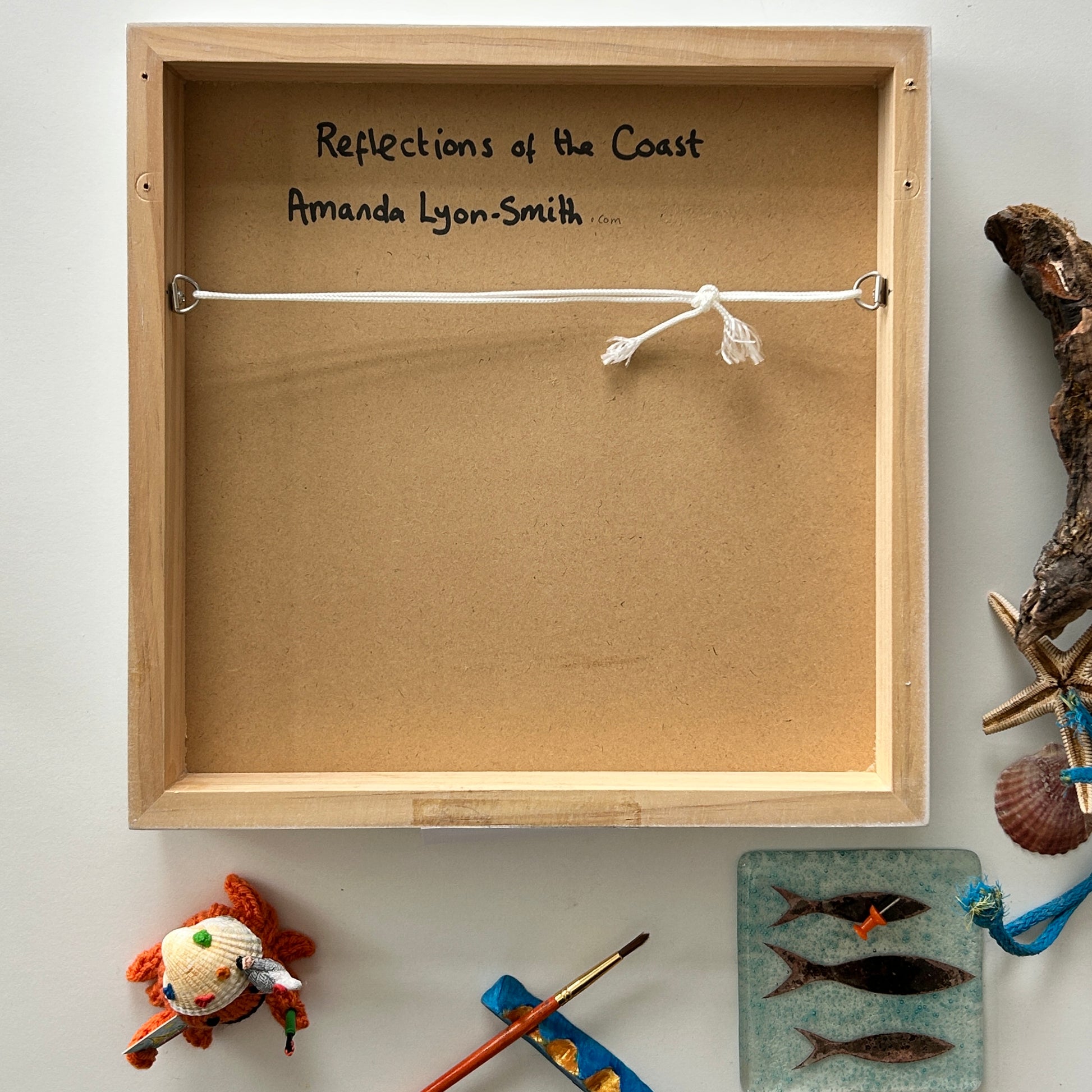 ‘Reflections of the Coast’ is mixed media, including collaged flotsam on a solid cradled wooden board, strung and ready to hang or could equally work sat on a shelf.