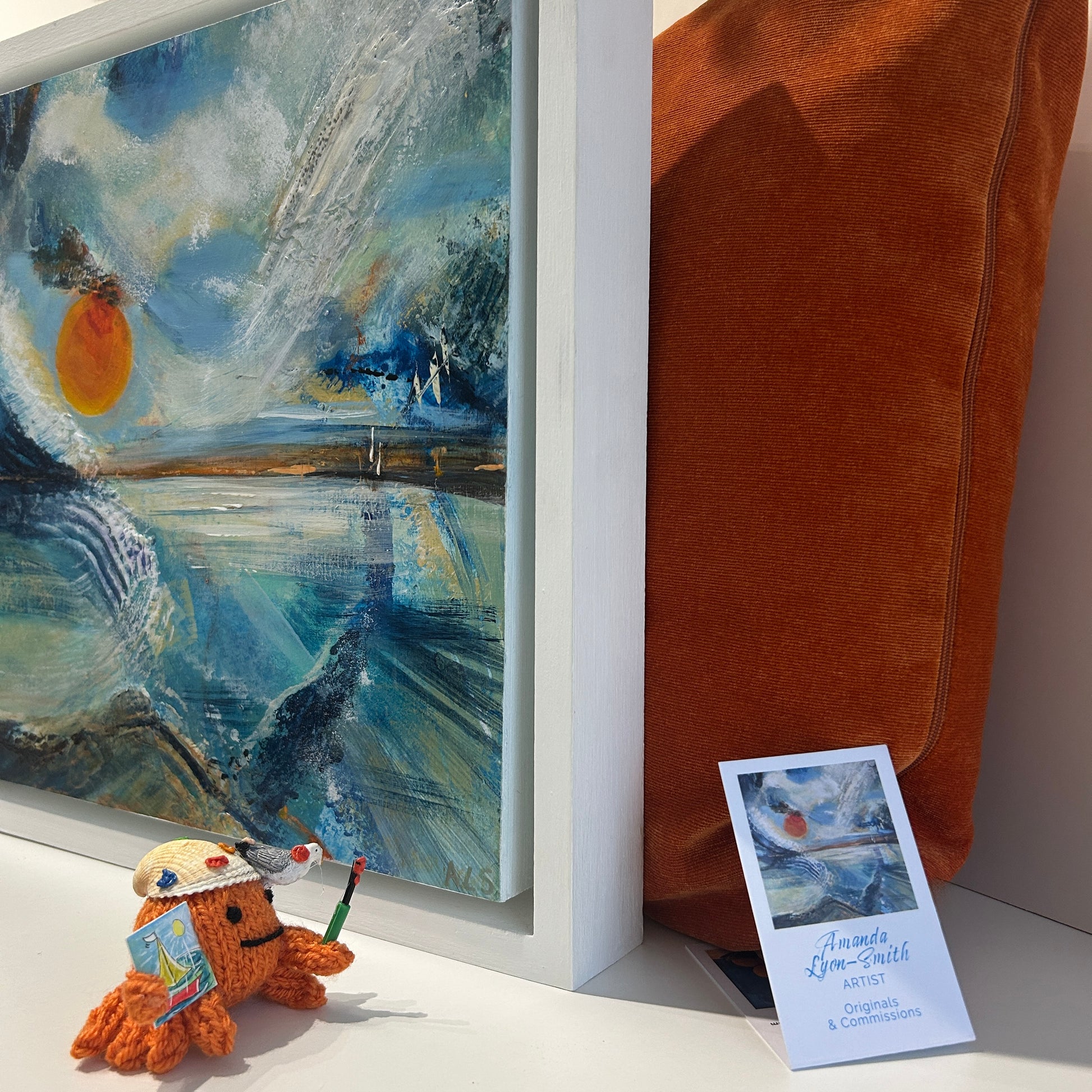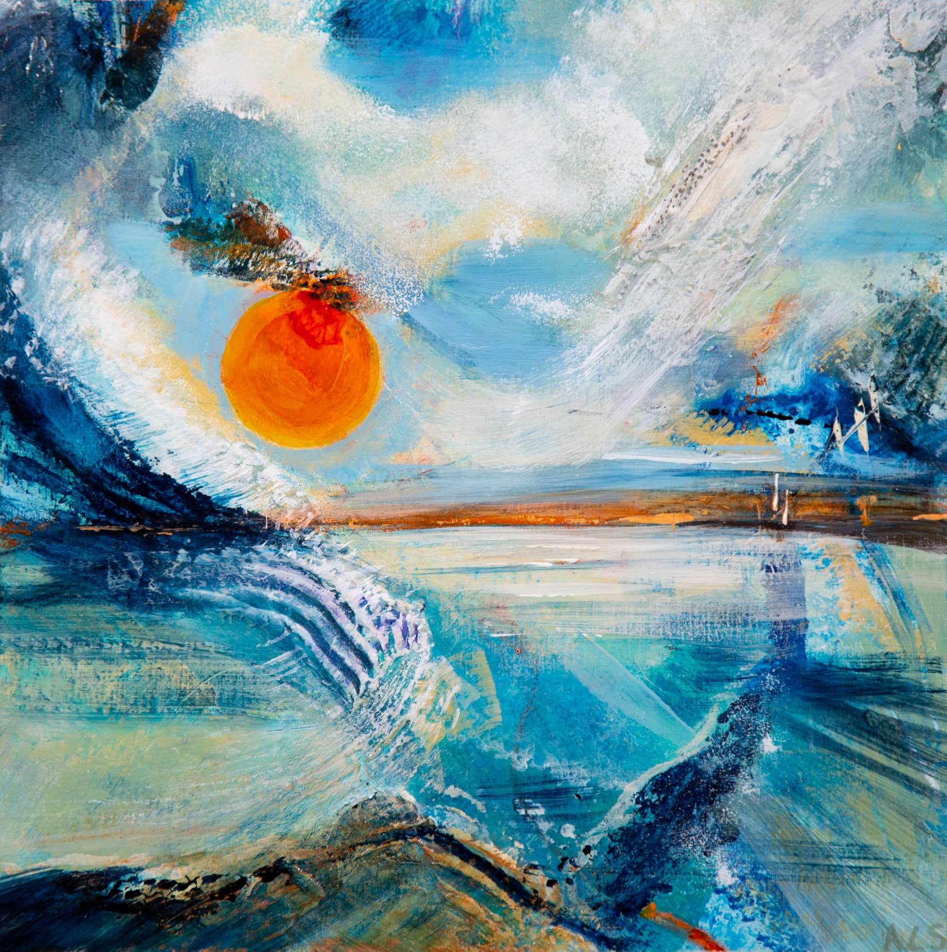 Bask in the radiant energy of SOL Searching, a striking Coastal Abstract. A bold orange sun radiates warmth amidst a swirling expanse of cool blues, turquoise and pure white, evoking the power and serenity of the sea. The dynamic brushstrokes and deep layered textures create a sense of movement and reflection. It invites contemplation and inner calm whilst igniting a sense of adventure. Perfect addition to any room in your home that needs a reminder of the wonderful optimistic healing energy of the combination of sea, sun and sky.