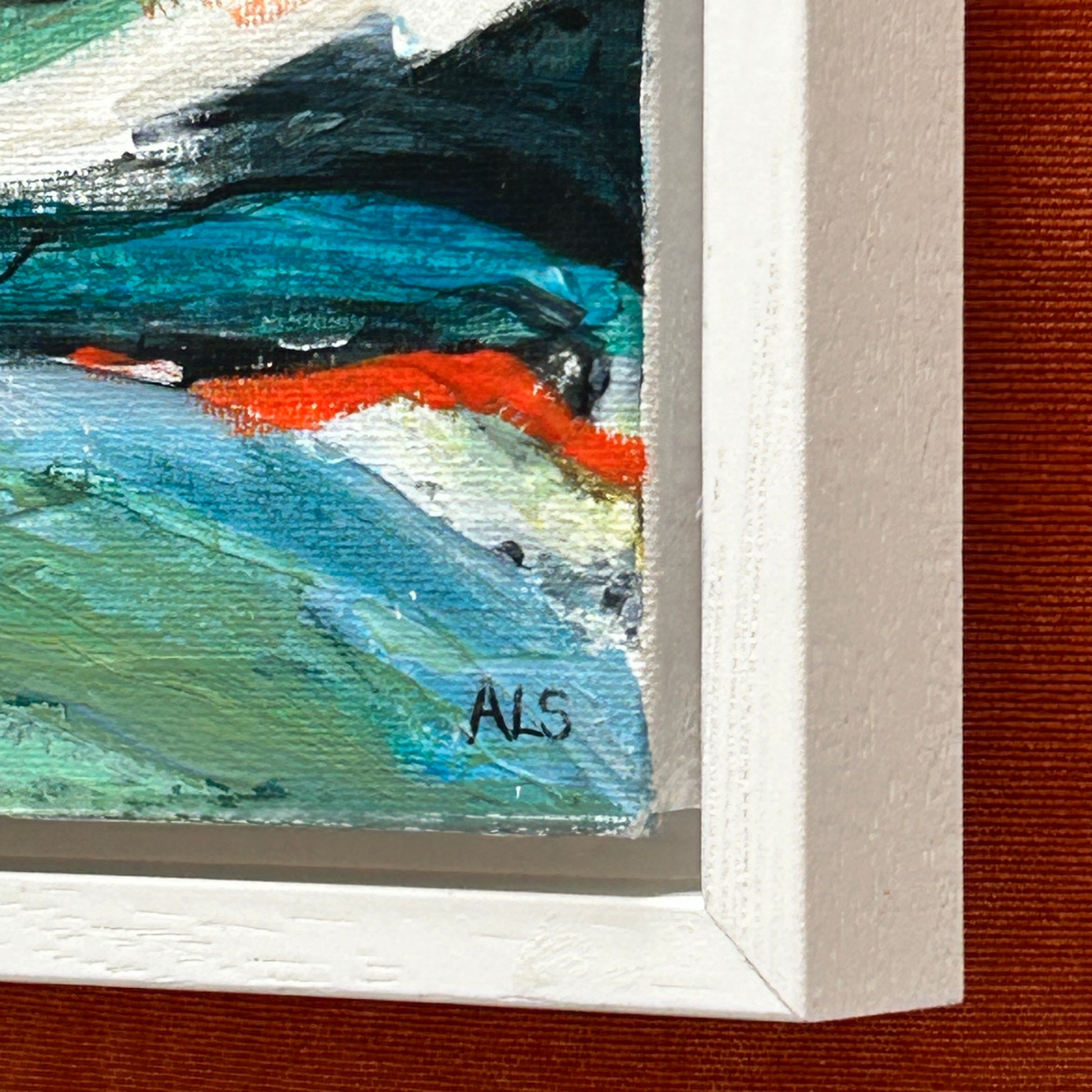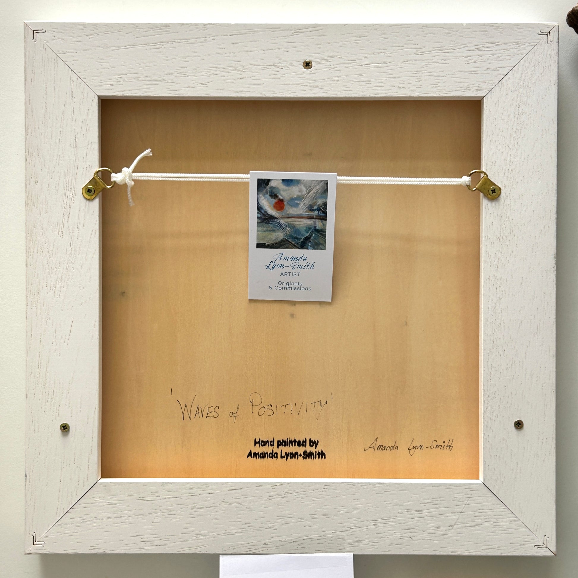 Waves of Positivity is Acrylic and mixed media on a canvas board set on cradled wood and framed in a lovely white wooden float frame.