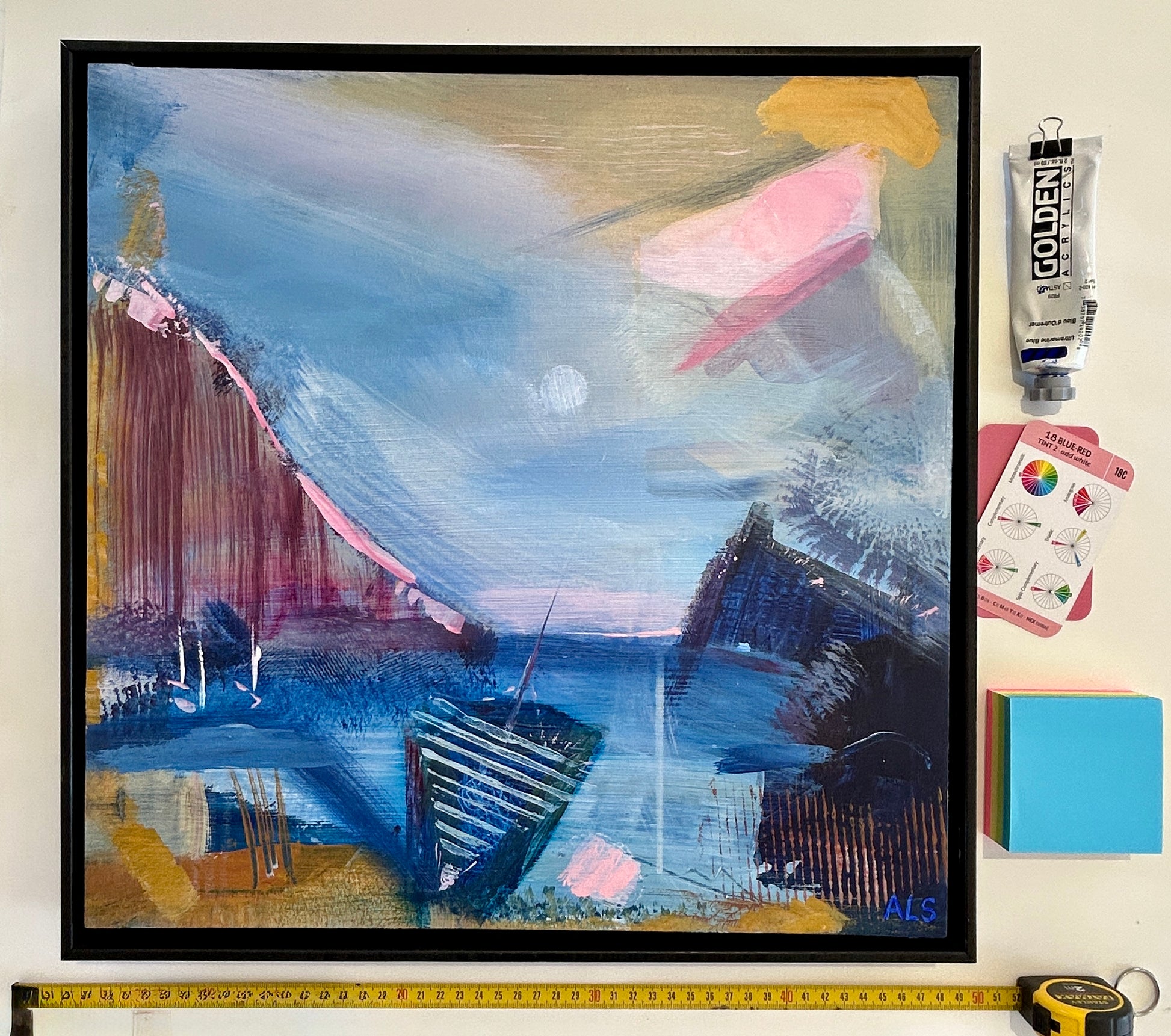 ‘Utopia’s Shipwreck’ is a dreamlike abstracted seascape that invites reflection on lost paradises and imagined journeys. With a palette of soft blues, dusky pinks, and golden accents, this modern coastal painting blends fantasy with fragments of reality—a stranded boat hints at adventure paused. Full of atmospheric movement and textured marks, it evokes both serenity and mystery, like the remnants of a story half told. Ideal for contemporary interiors, coastal homes, or creative spaces, this artwork brings a thoughtful, imaginative energy to any setting. Abstract coastal art, modern seascape, boat painting, contemporary maritime artwork—this piece is as poetic as it is visually striking