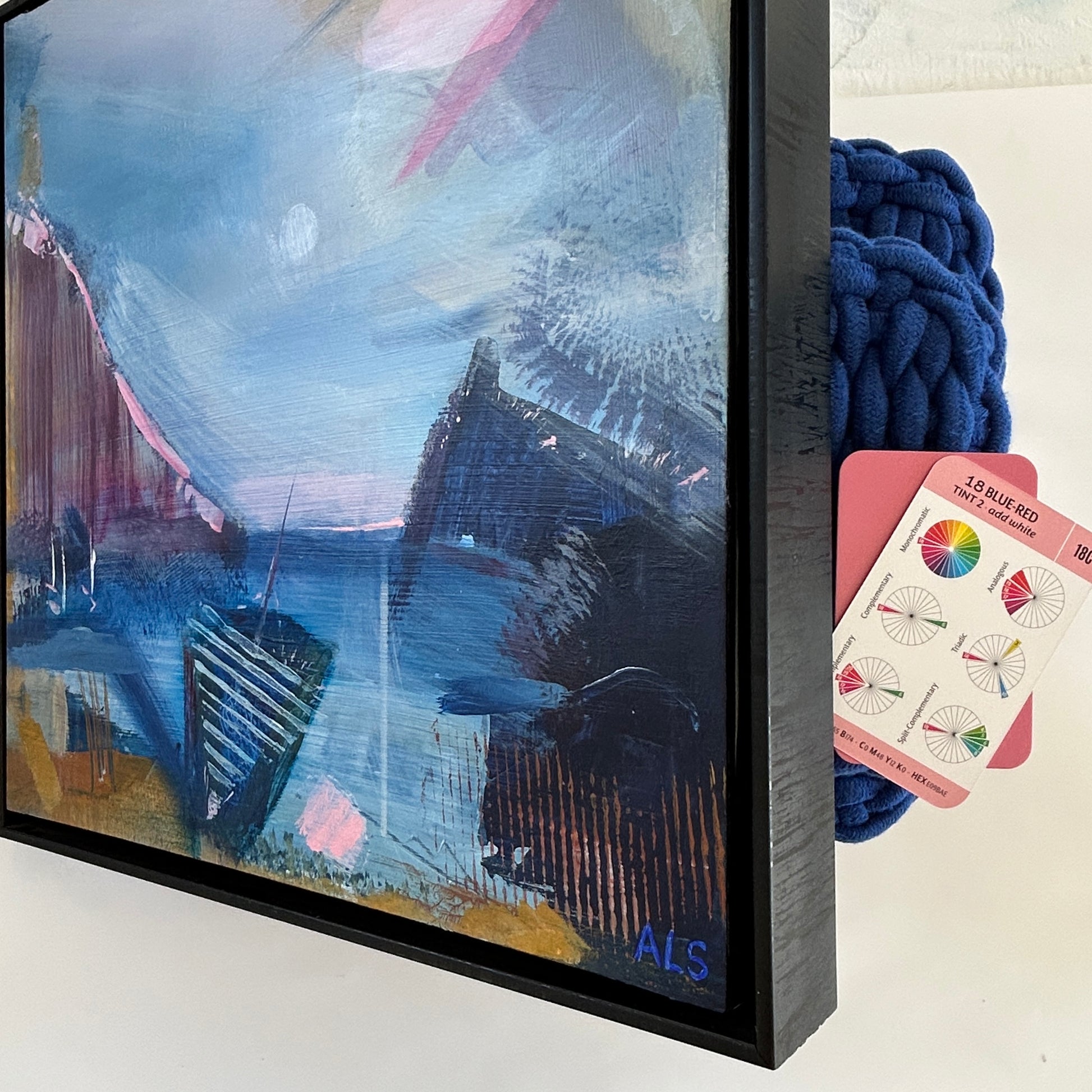Utopia’s Shipwreck is Acrylic and Mixed Media onto cradled stretched canvas set in a black float frame, strung and ready to hang.
