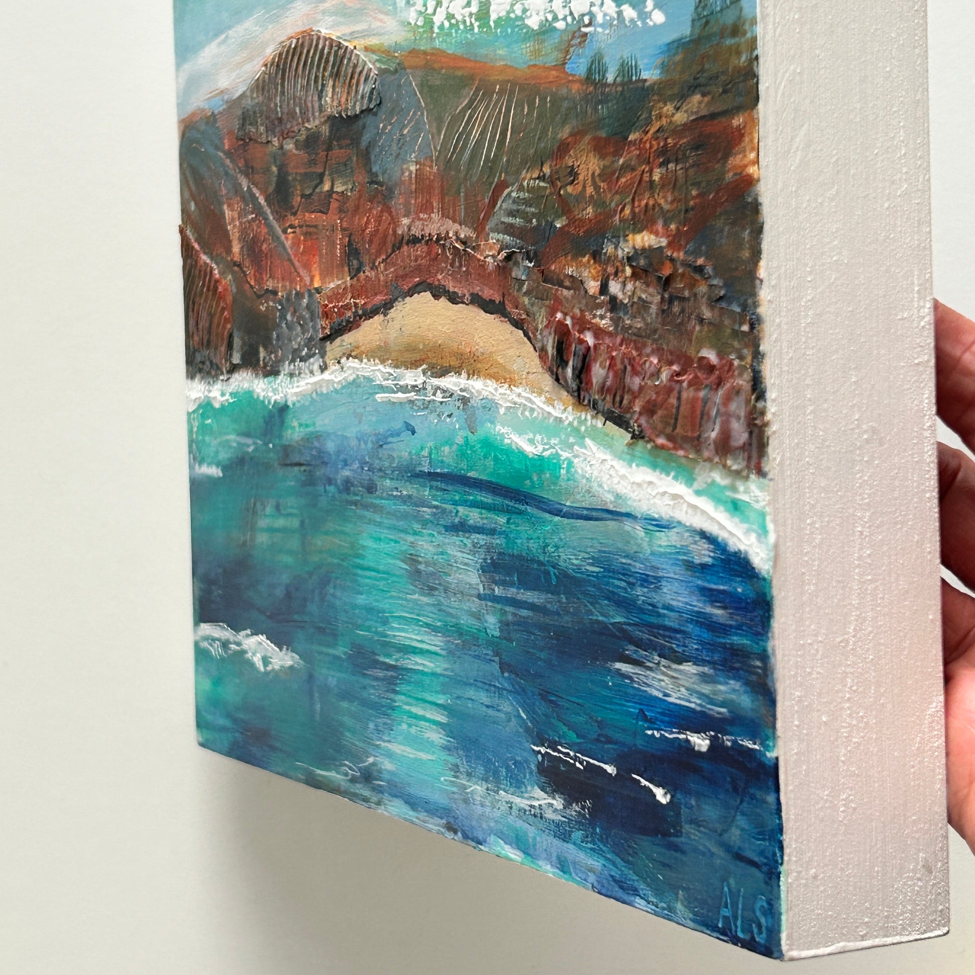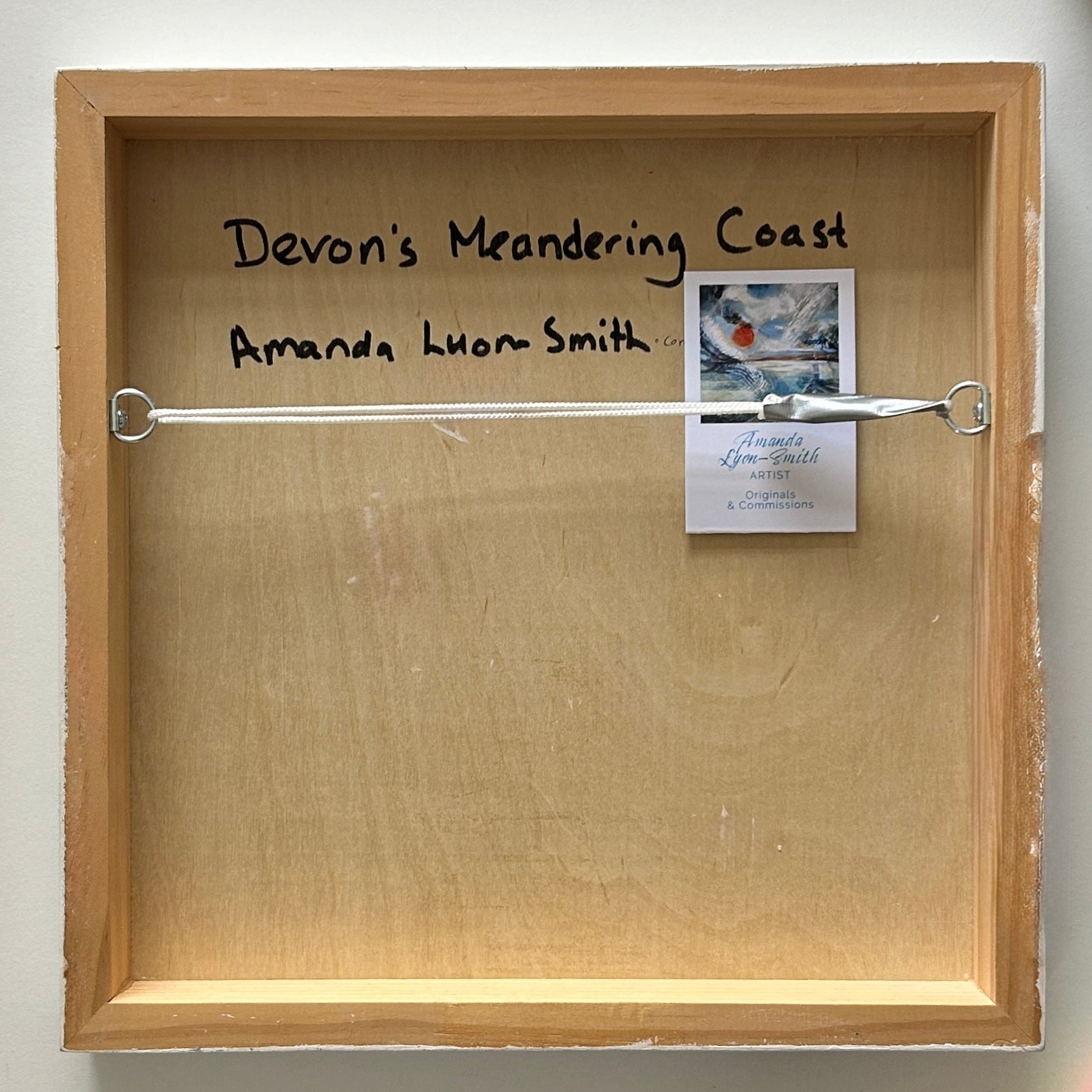 ‘Devon’s Meandering Coast’ is mixed media, including collaged painted corrugated cardboard on a solid cradled wooden board, strung and ready to hang or could equally work sat on a shelf.
