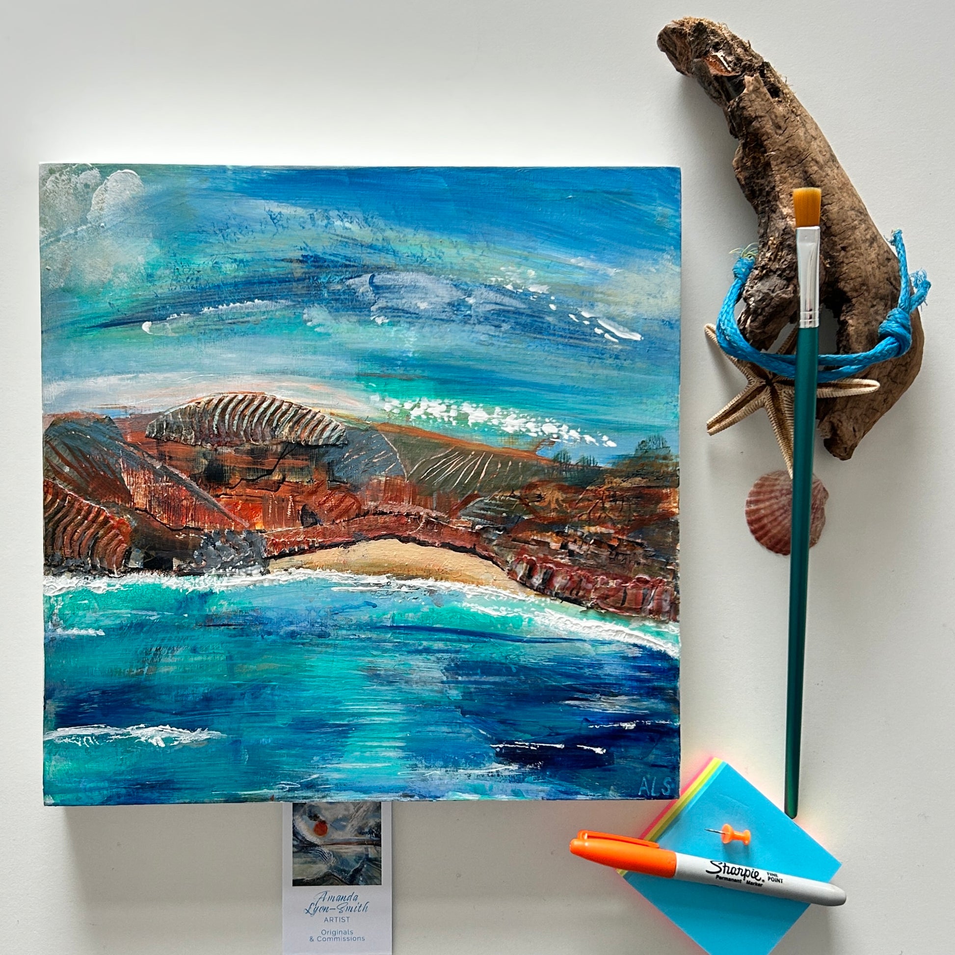 This tactile coastal-inspired mixed media painting, including collaged corrugated card, representing the ploughed ruts of Devon fields, captures the ruggedness of this impressive red earthed coastline. A serene turquoise blue sea below and the dramatic brush-strokes of the sky above, give a lovely sense of movement and harmony. This piece brings a sense of vastness and wonder to any space, perfect for a modern seaside interior, a contemporary home, or any room seeking a touch of coastal drama. An uplifting artwork that energises and inspires those who experience it. It works wonderfully as a diptych with ‘Vaulting Shoreline’