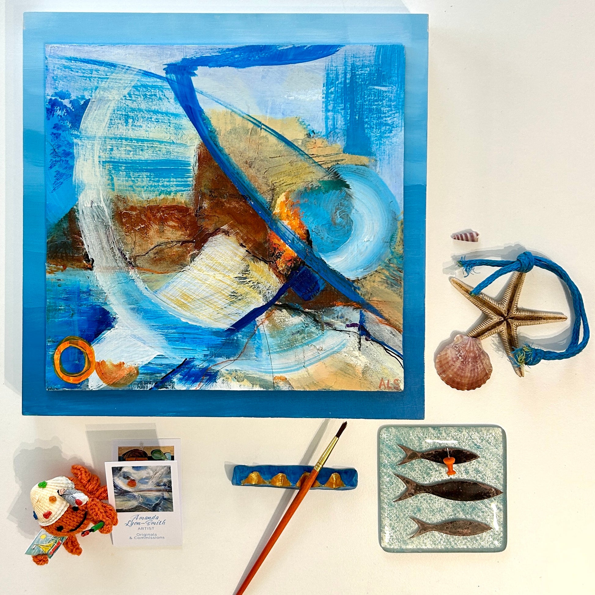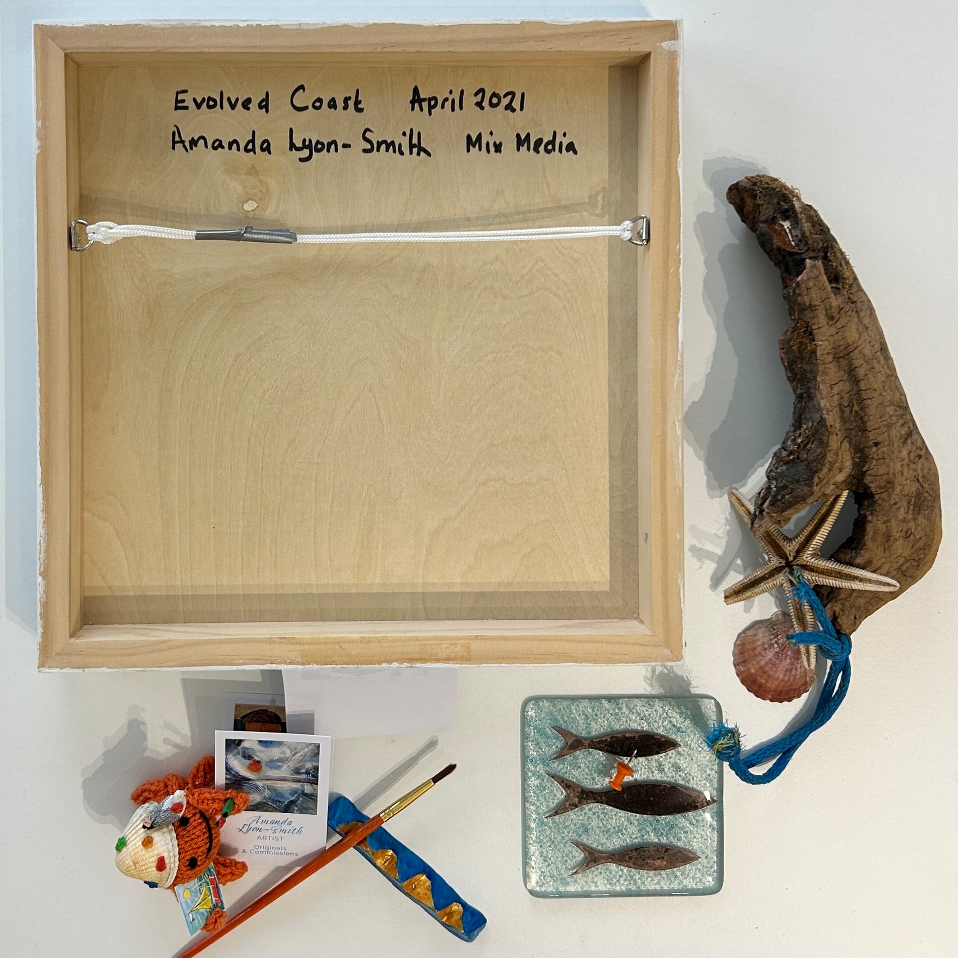 Evolved Coast is Acrylic and mixed media on ply set on primed cradled wood. Strung on the back ready to hang or could equally work sat on a shelf.