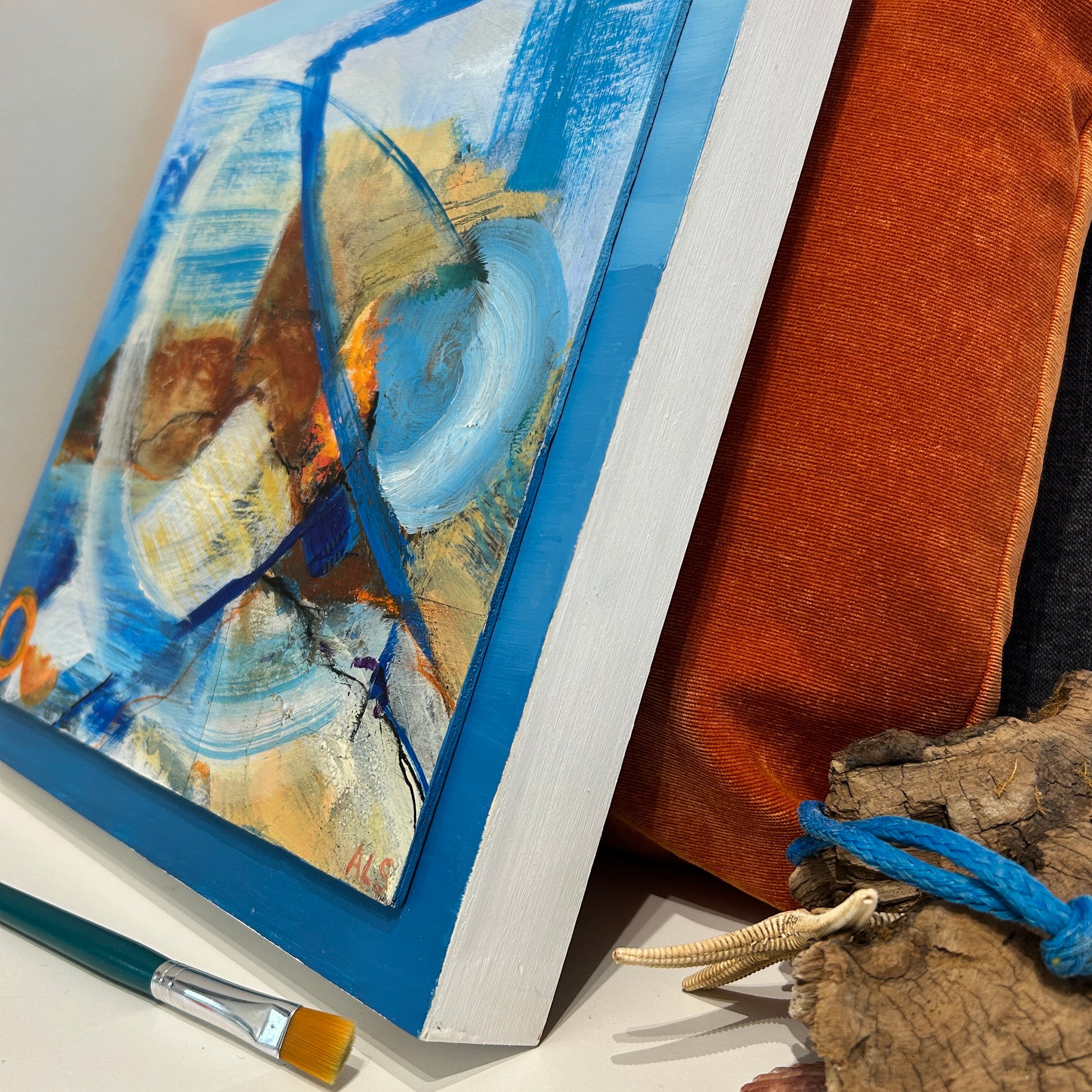 This dynamic Coastal inspired Abstract captures the essence of seaside living here in Teignmouth, Devon. It’s vibrant uplifting hues of blue represents the sky and sea, the warming reds of our sandstone cliffs, serene sandy coves and those pops of fiery sun orange evoke a sense of movement, harmony and transformation. A true connection to nature’s energy. This original artwork would make a stunning addition to contemporary, coastal, modern and nature inspired interiors, bringing warmth and vitality to many spaces such as sunlit lounges, creative areas, hallways or nooks in need of refreshing.